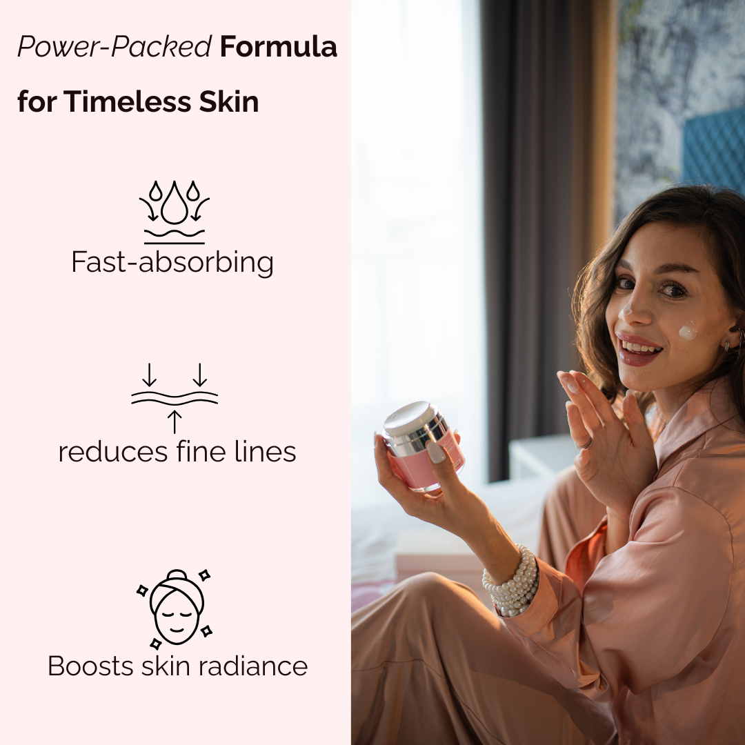 Premium ingredients like collagen and hyaluronic acid work together to reduce fine lines, firm the skin, and visibly smooth the complexion.